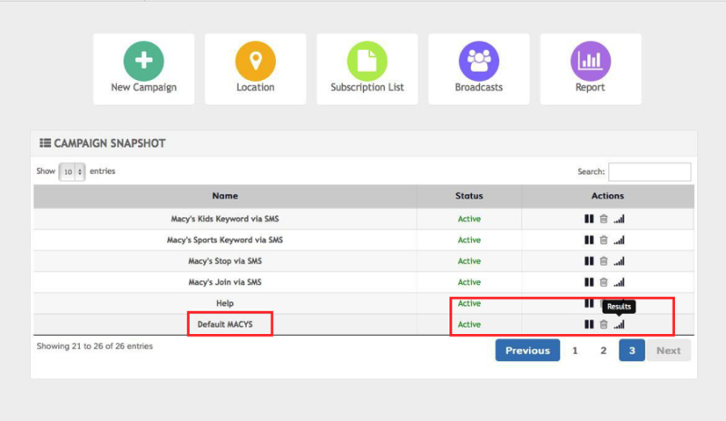 The main Keywords screen shows all the interactions that are created, the status and options to pause, copy, delete or see the results from that specific campaign: