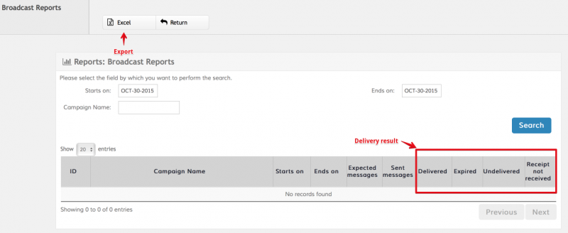 | Expired | Number of messages that the mobile operator couldn't deliver in their established amount of time. A delivery receipt with a “EXPIRED” status is received by the campaign manager |