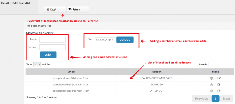 All blacklisted email addresses are listed: The list can be searched and exported to an Excel file.