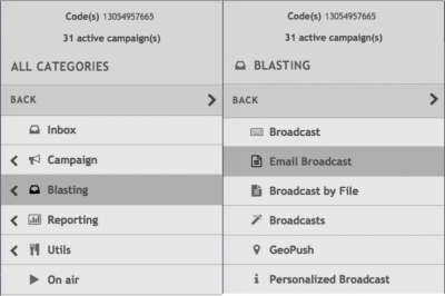 To create an Email Broadcast campaign navigate to the Blasting submenu in the Main Menu and select Email Broadcast: