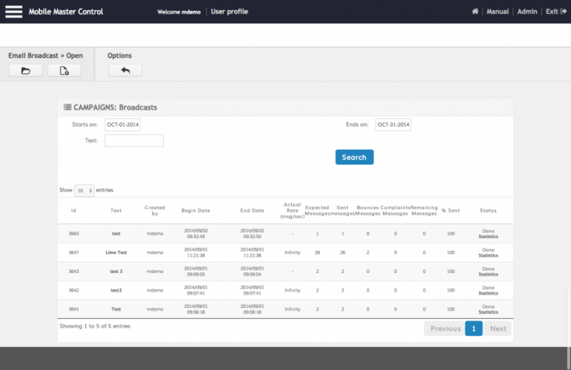A Broadcast campaign is an MT or Email campaign that sends messages to specific distribution groups. Marketers will use blast campaigns to send out promotions to targeted mobile numbers or email addresses. Distribution groups for blast campaigns can be an opt-in based group (derived from the MO based campaigns described in this document), a custom group or a combination of multiple groups.
