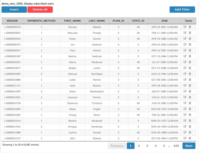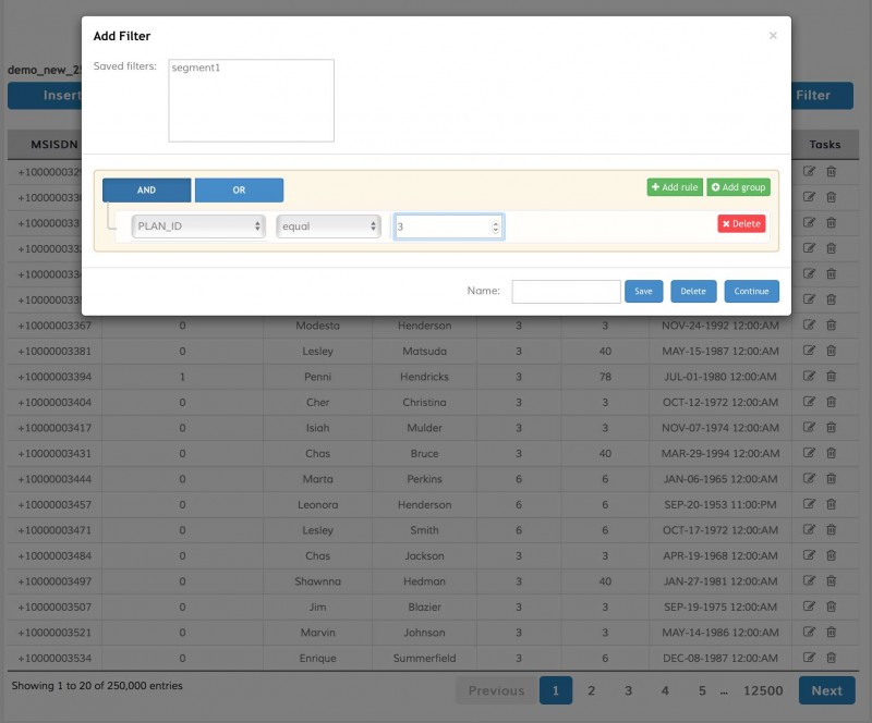 Clicking on the *Add Filter* button will display the filtering and segmentation interface, letting you add filters to the fields depending on the type detected or selected at creation time. In this example we are adding a filter to display subscribers with PLAN_ID of 40: