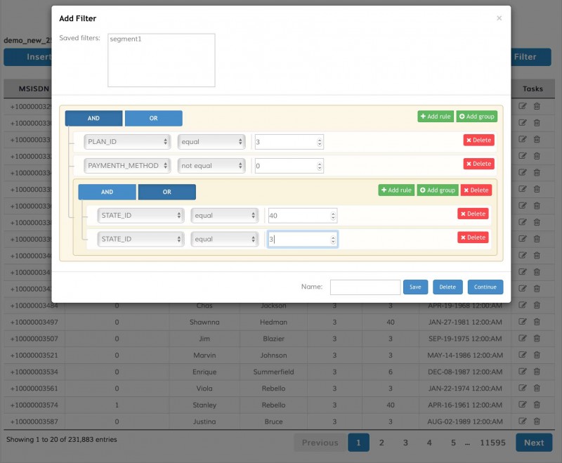 Filters can be as complex as needed. For example the following filter will only select users with a PLAN_ID of 3, a PAYMENT_METHOD different than 0, and in STATE_ID 40 or 3: