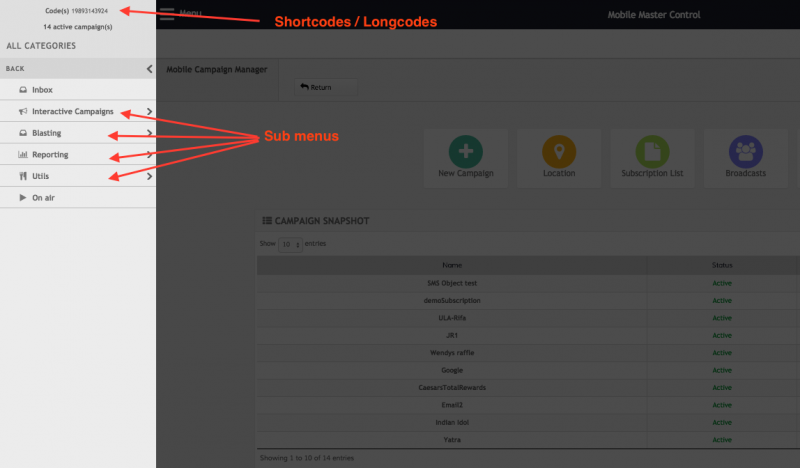 Clicking on the Main Menu Button will slide the Main Menu Panel from the left of the screen. In the Main Menu Panel you will see the a brief header with the available shortcodes and the Main Menu options. When navigating the Main Menu you will find options preceded by a < sign. Those options are sub menus that group additional options. So for example if you wish to set up an On-Demand Info campaign, you would click on Campaign and then On-Demand Info.