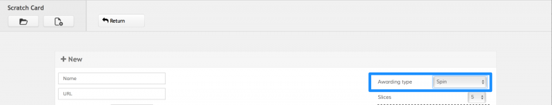 This will open the New Scratch Card screen, therefore, for the purpose of using the Spin-2-Win mechanics, please change the Awarding type to Spin as follows: