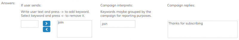 | Further inputs | In case an user sends the keyword more than one time, this option has 3 possible configurations: “Regular reply” will always return the same default message configured with the keyword; “Ignore input” will skip the input and will not return a reply; and finally “Custom reply” will allow the campaign operator define a custom message (e.g “you are already subscribed”) |
