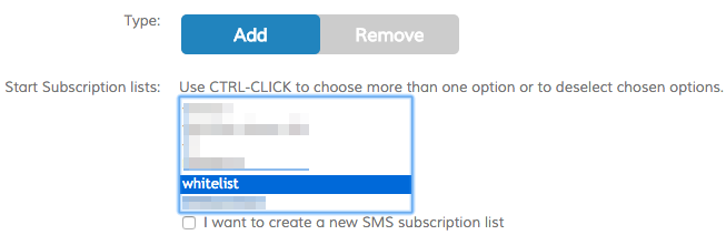 Select the parameters that will define the type of campaign (add or remove a subscription) and the list(s) that we are going to point on. If you select type Add this will be an opt-in campaign (add users to the list). If you select type Remove this will be an opt-out campaign (remove users from the list)