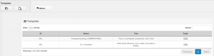 The main templates screen shows all the templates that are currently configured and active. The IDs are unique for each template. From here we can edit, delete or create a new Template: