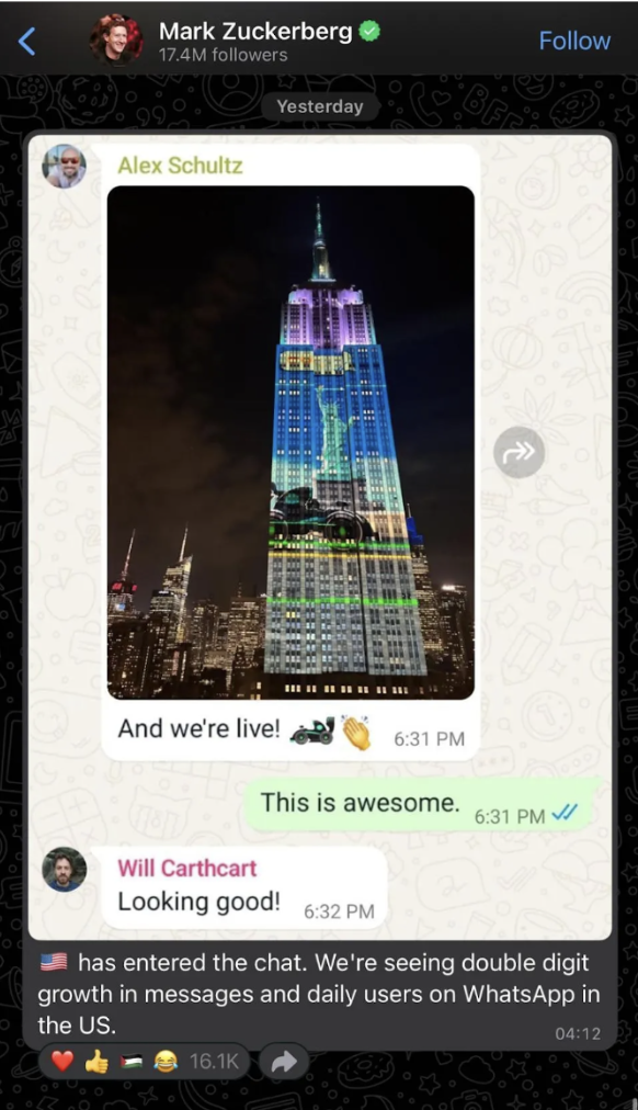 También señaló que «EE. UU. ‘ha entrado en el chat’. Estamos viendo un crecimiento de dos dígitos en mensajes y usuarios diarios en WhatsApp en EE. UU.», señalando una trayectoria de crecimiento robusta que podría posicionar a WhatsApp como un serio competidor de Apple Messages, desafiando su estatus como la aplicación de mensajería más popular en EE. UU. Fuente